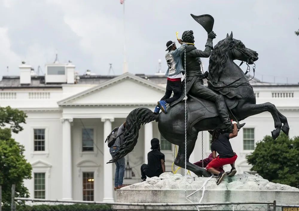 上图为抗议者试图拆除白宫附近的安德鲁·杰克逊雕像